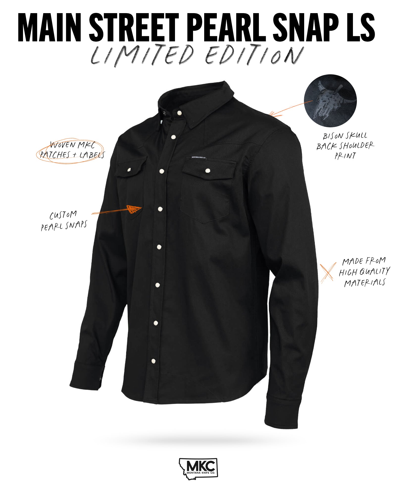 The Main Street Pearl Snap is made for the places that bring a town to life—your favorite bar, the best burger spot, or that steakhouse only the locals know about. This long sleeve blends classic Western style with MKC’s rugged attitude. The olive version features a custom MKC knife pattern, while the black keeps it clean and understated. Comfortable, durable, and built to be worn anywhere.