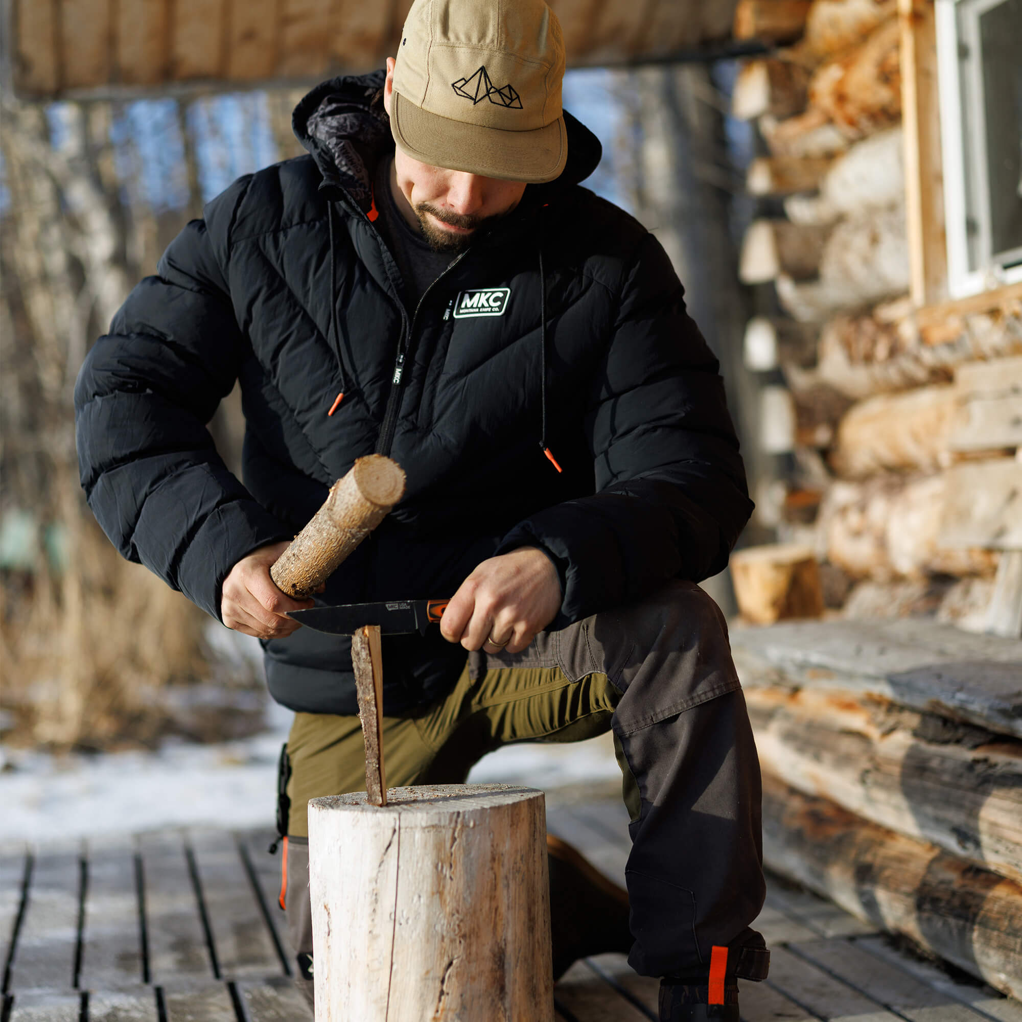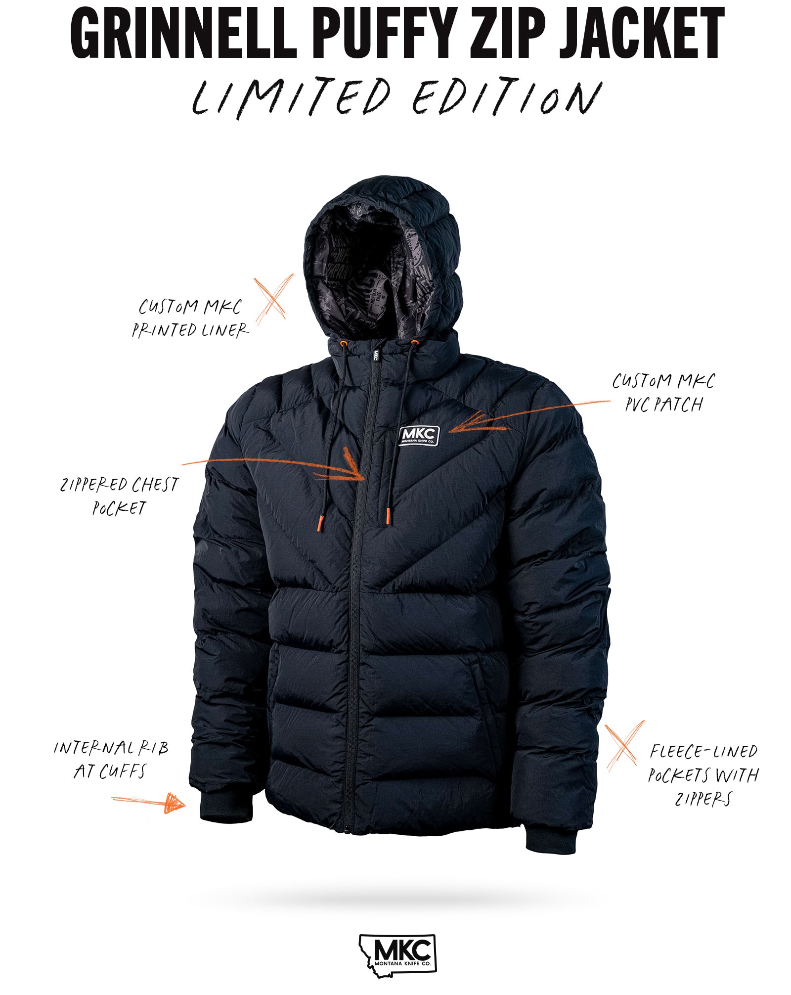 We packed this puffy jacket with 800 gsm synthetic fill because when temperatures drop, and we mean it, this thing is a furnace. The two hand pockets are lined with ultra warm sherpa fleece for cold hands. Internal ribbing at the sleeve cuffs seals out the cold. Dipped drawcords. Custom MKC PVC patches and printed liner throughout.