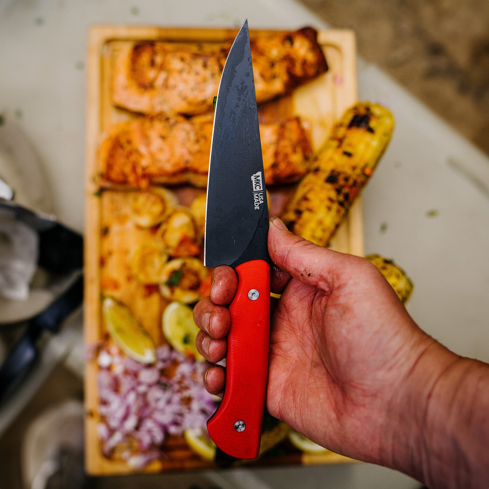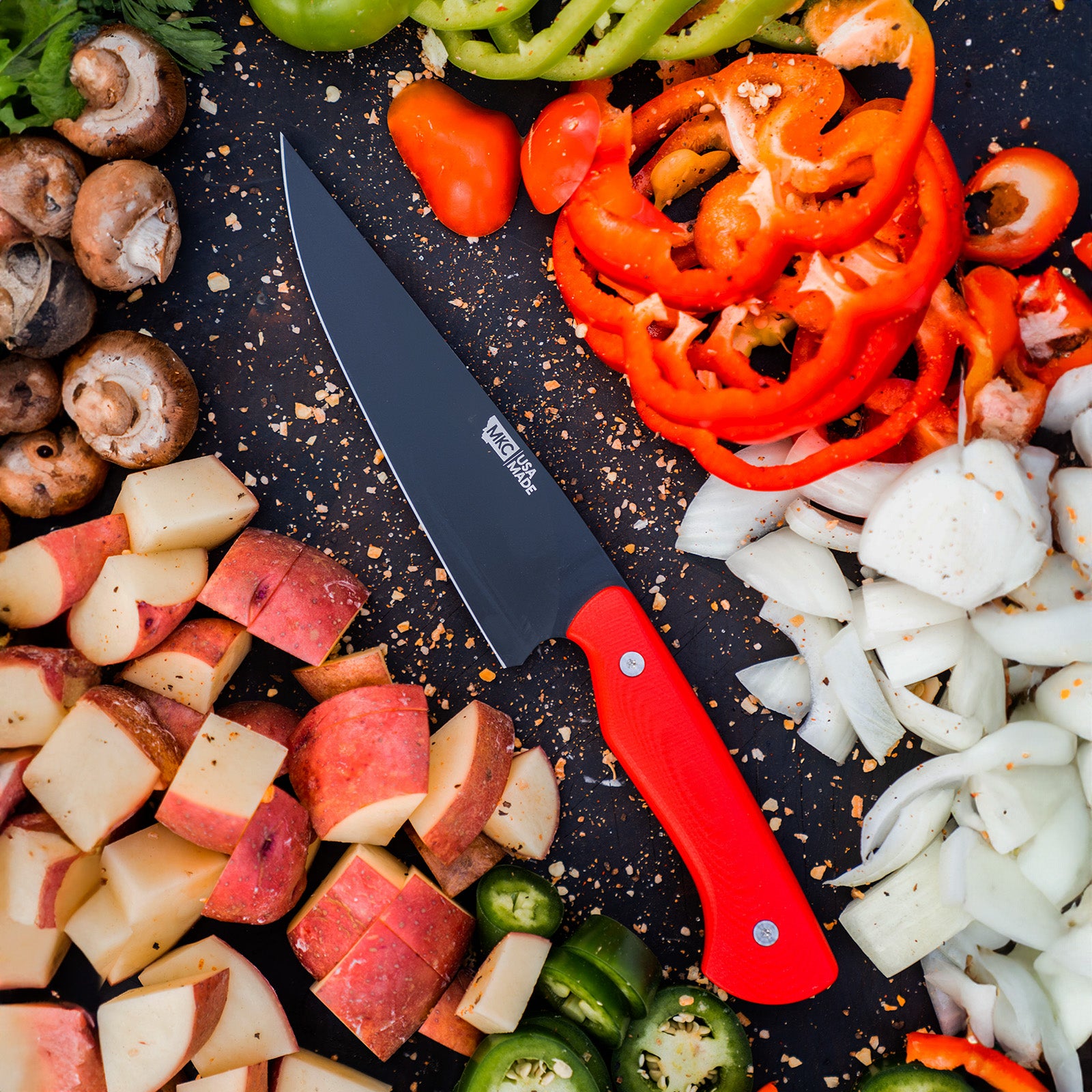 The word petty in petty knife literally comes from the French word petit, which means “small.” While the Bighorn Chef’s Knife excels at large slicing tasks, like breaking down large fruits and vegetables or big cuts of meat, the smaller, handy MKC Petty Knife is perfect for finer tasks in the kitchen. Petty knives are essentially utility knives used for work done off the cutting board. It’s the knife you use when you’re cutting a vegetable in your hand or breaking down a chicken.