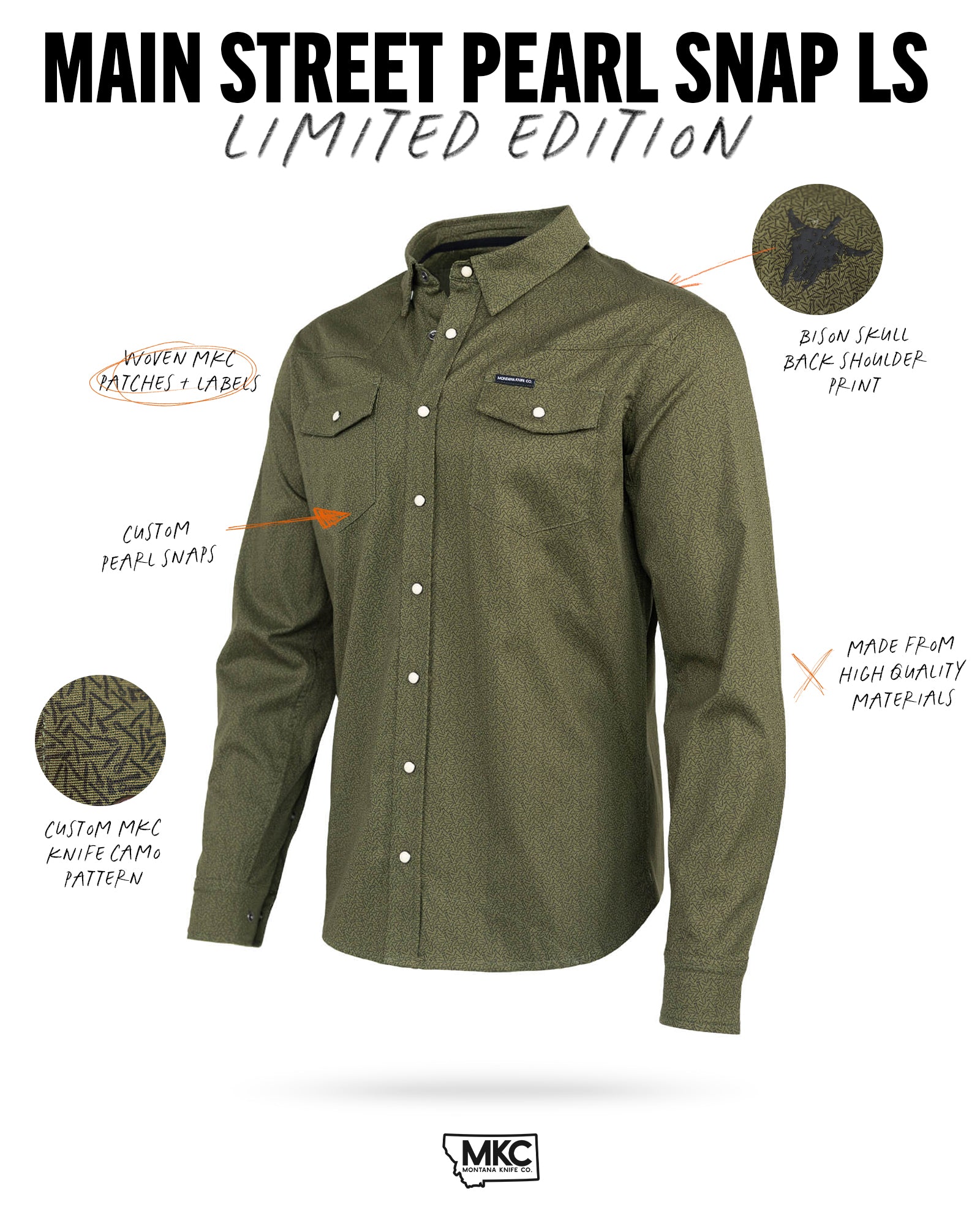 The Main Street Pearl Snap is made for the places that bring a town to life—your favorite bar, the best burger spot, or that steakhouse only the locals know about. This long sleeve blends classic Western style with MKC’s rugged attitude. The olive version features a custom MKC knife pattern, while the black keeps it clean and understated. Comfortable, durable, and built to be worn anywhere.