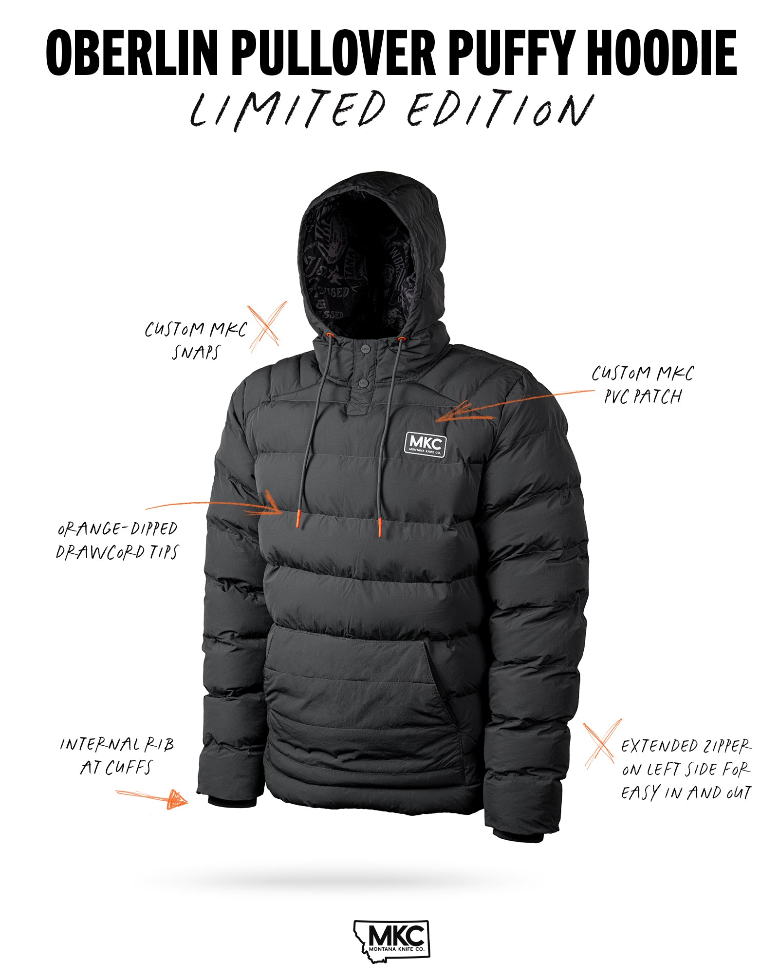 We packed this puffy jacket with 800 gsm synthetic fill because when temperatures drop, halfway warm doesn't cut it. The kangaroo pocket is lined with ultra warm sherpa fleece for cold hands. Internal ribbing at the sleeve cuffs seals out the cold. Custom MKC snaps at the front. Dipped drawcords. Custom MKC PVC patches and printed liner throughout.