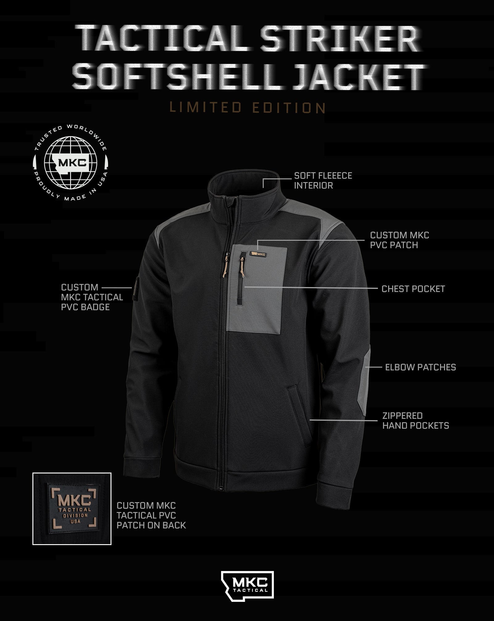 Any situation, any environment. The MKC Tactical Striker Softshell Jacket keeps you protected and mobile when the weather turns for the worst. The breathable outer shell and reinforced elbow patches handle hard use, while the soft fleece interior gives you cold-weather capability without the bulk. Features the MKC Tactical Mark with the We Are The Violent Ones Grim Reaper inside the front chest.